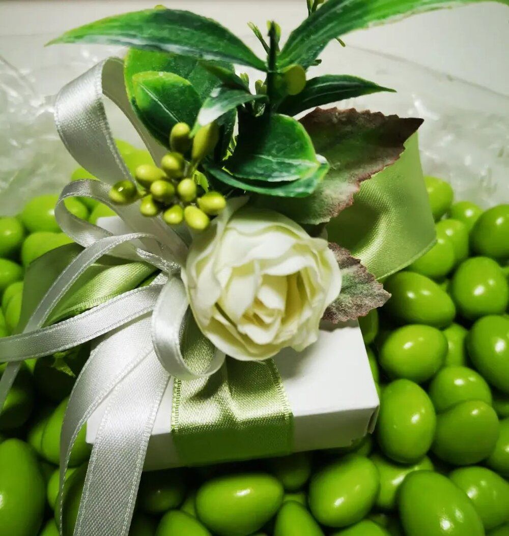 La tradizione vuole che il colore dei confetti sia bianco. Ma nessuno vieta di scegliere il colore in base all'abito della sposa, accostandosi a tonalità ecrù o pastello, per questo Bomboniera Più propone confetti di vari gusti.